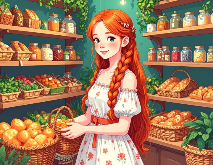 Firefly_12 jähriges mädchen mit roten Haaren einem geflochtenen Zopf ein geblümtes Kleid in s 358510